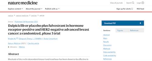 11月4日,国际四大医学期刊之一、英国《自然》旗下《自然医学》(Nature Medicine)在线发表CDK4/6抑制剂达尔西利(SHR6390)联合氟维司群治疗既往内分泌治疗后疾病进展的HR+/HER2-晚期乳腺癌的多中心、随机、双盲III期临床研究(DAWNA-1研究)中期分析结果报告,首次对氟维司群(雌激素受体降解剂)±达尔西利治疗激素受体阳性晚期乳腺癌的有效性和安全性进行了比较。研究结果显示,达尔西利+氟维司群组与安慰剂+氟维司群组相比,无进展生存期(PFS)显著延长。该项研究由中国医学科学院肿瘤医院徐兵河教授担任leading PI,全国39家医院参研,由尊龙凯时国际医药临床研发团队支持完成。