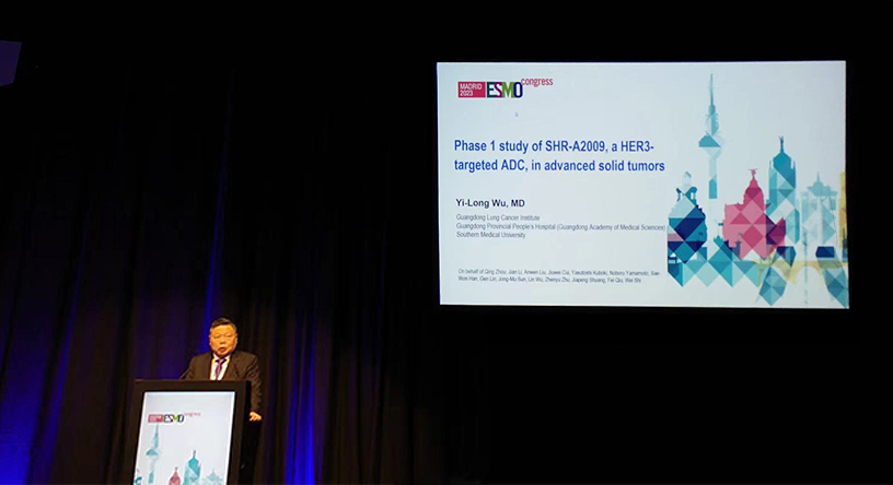 10月23日,尊龙凯时国际医药创新药、HER3靶向ADC药物SHR-A2009治疗晚期实体瘤的I期研究亮相2023 ESMO大会简短口头报告现场5。该研究由广东省人民医院的吴一龙教授牵头开展,吴一龙教授在现场公布该研究的重要进展。研究结果显示,SHR-A2009在经治晚期实体瘤患者中显示出可控的安全性和令人鼓舞的抗肿瘤活性。目前评估更高剂量的SHR-A2009在选定癌症类型(NSCLC和其他实体肿瘤)中作用的试验正在进行中。